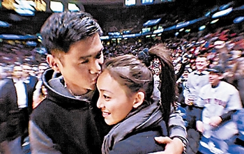 黑人說,易建聯(lián)建議他要在中場時(shí)間求婚,當(dāng)時(shí)場內(nèi)的老外球迷也充當(dāng)“助攻員”,不斷鼓掌起哄,讓范范最后點(diǎn)頭同意嫁他。他很愛籃球,求婚當(dāng)天又是籃球巨星喬丹的生日,如今又求婚成功,意義重大,加上范范應(yīng)邀在NBA球賽開幕時(shí)演唱美國國歌,此行“成果豐碩”。