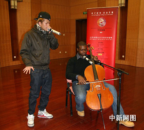 中新網12月10日電 昨日下午,北京電視臺《環球春晚》的排練廳迎來了兩位不同國際的特殊組合,來自美國的凱文和上海的蟲二,他們用Beat-Box這種特殊的“口技”表演為在場觀眾獻上了一份另類“大餐”。