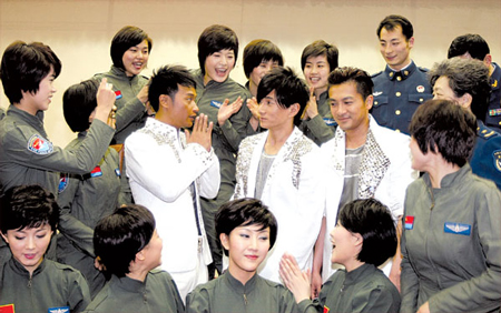 16位曾翱翔的藍天上的女飛行員們,一股腦兒地擠上前去與偶像合影,當紅女星閆妮則一掃平日里的害羞個性,看到小虎隊三人時像個小粉絲一樣跳起來表達著自己的興奮之情。一片混亂中,有位央視的記者一不留神被擠掉入彩排大廳一號入口處的水池里。某家網站的攝像記者在跟隨著小虎隊的步伐倒退著拍照時,突然流下眼淚,之后他對同行說:“鏡頭一推上去,實在是觸景生情,可能是太久沒有看到他們三個人一起出現了。”