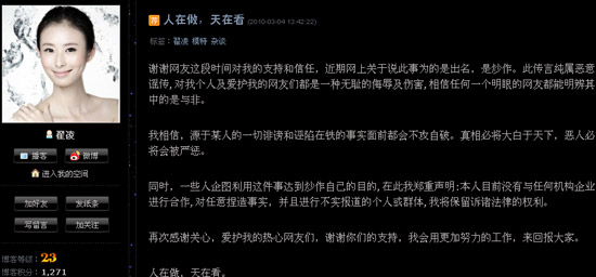 2月25日,“獸獸”翟凌利用博客發表聲明,就“艷照門”事件及相關不雅視頻在網絡上瘋傳一事進行公開表態。