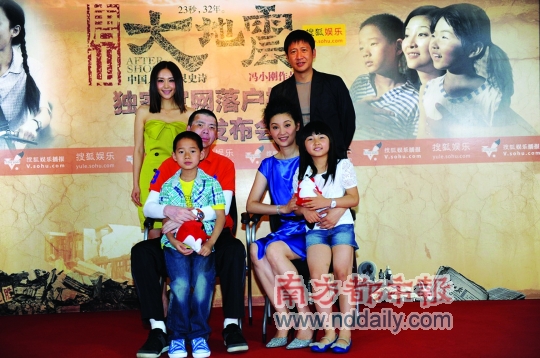 昨日,即將于7月22日在內地、香港、臺灣同步上映的《唐山大地震》在搜狐網開通了電影官方網站,導演馮小剛攜主演徐帆、張國強等出席發布會與網友一同分享了他們關于30年前的記憶,并首度向外界公布了影片中“張國強、徐帆一家”的全家福照片。而在隨后的采訪中,馮小剛則否認了徐帆因為是自己妻子才得以出演《大地震》的傳聞,“徐帆的水平在那兒擺著,她撐起了這部電影的魂。”同時,對于影片的票房,馮小剛再次放出豪言,“誰不服,就和《大地震》同天上映!”