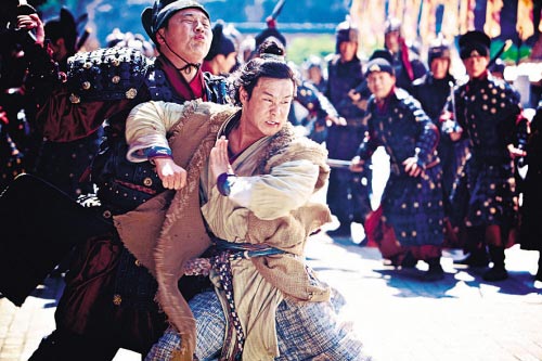 如果說被鋼絲吊在半空“飛”難不倒小沈陽,那么接下來的打戲則是難度不小,因?yàn)樾∩蜿柭暦Q不必用替身,而程小東又是有名的較真導(dǎo)演,對動作細(xì)節(jié)的要求之苛刻達(dá)到“令人發(fā)指”的程度,因此小沈陽接受了更大的挑戰(zhàn)。這段時間橫店悶熱難耐,有一場小沈陽殺進(jìn)皇宮英雄救美的戲,對手演員是片中大反派——第一高手徐少強(qiáng)。這種天氣穿著厚厚的古裝拍戲,即便站著不動都會汗流浹背,何況還是拍動作戲,當(dāng)小沈陽在程導(dǎo)的指揮下一遍遍拳打腳踢、跳躍騰挪后,早已是揮汗如雨,幾乎每拍一個鏡頭都要換下一身汗?jié)竦膽蚍?/p>