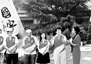 圖為成龍(右)等主創人員在西柏坡舉行的《國家》MV首映典禮上亮相