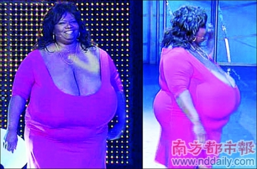 意大利一檔電視節(jié)目日前舉行了“全球最大胸圍女人”的比賽。美國(guó)30歲的女子諾瑪·斯蒂斯,以67英寸的傲人胸圍,連續(xù)10年勇奪“世界最大天然胸部”這一頭銜,她的一對(duì)乳房重量高達(dá)18公斤,創(chuàng)下吉尼斯紀(jì)錄。