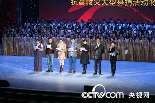 央視知名主持人周濤、朱軍、董卿、張澤群將作主持、采訪人;白巖松、李瑞英作新聞連線人;李詠、畢福劍、馬東、朱迅、任魯豫、崔永元、王小丫、撒貝寧、鞠萍、韓喬生、董浩、歐陽夏丹、李梓萌、胡蝶、魯健等50人擔任現(xiàn)場捐助熱線電話接線員。