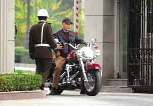 日前某天下午記者看見葛優騎著一輛嶄新的國產某品牌大型摩托車駛出別墅大門,他穿著休閑夾克,戴著一頂棒球帽,端坐車上,滿臉含笑,經過大門時還主動朝保安點頭,看上去心情超爽,一出別墅大門,葛優便加大油門,繞著別墅疾馳起來,他姿態瀟灑,動作嫻熟,仿佛是一位正在前去參加“方程式”比賽的摩托騎手。幾分鐘后,葛優結束了這次短暫的兜風,帶著煥發出的一種少有的活力返回別墅。卓 偉