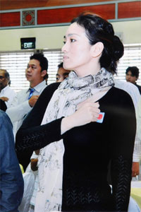 在儀式結(jié)束后接受記者訪問的李美花說,她也是當天中午抵達時,才知道,大明星鞏俐將會出席宣誓儀式。鞏俐上臺時,李美花還特別送上恭喜,表示很開心她能出席。