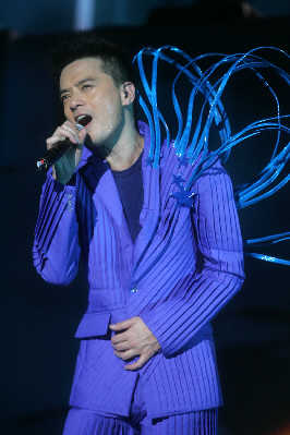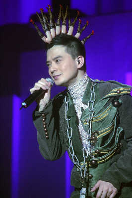 與其他流行歌手的演唱會(huì)相比,昨夜的上海大舞臺(tái)并未爆滿,但好在滿場(chǎng)都是黃耀明以及“人山人海”的死忠粉絲,所以當(dāng)周耀輝、當(dāng)李端嫻、當(dāng)AT17的ELLEN以及林一峰等人陸續(xù)入場(chǎng),均收獲了粉絲的熱情尖叫。整個(gè)現(xiàn)場(chǎng)猶如“人山人海”與家人的節(jié)日聚會(huì)一般熱鬧,還未開(kāi)場(chǎng),內(nèi)場(chǎng)前區(qū)已經(jīng)擠滿了隨著音樂(lè)跳躍的歌迷。當(dāng)燈光全部暗下,伴隨著歌迷熱情的歡呼聲,黃耀明猛然出現(xiàn)在舞臺(tái)正中,幕布尚未全部拉開(kāi),身著白色羽毛褲的黃耀明唱起歌曲《下世紀(jì)再嬉戲》。戴著黃耀明經(jīng)典的妖精耳朵或者頭頂白色長(zhǎng)發(fā)的歌迷們開(kāi)始集體大聲跟唱。或許對(duì)于不少死忠歌迷而言,這場(chǎng)演出仍然伴隨著許多遺憾,比如黃耀明的造型在早前許多演唱會(huì)上用過(guò),開(kāi)場(chǎng)的帽子曾在“滿天神佛”演唱會(huì)上用過(guò),羽毛褲則曾在“光天化日”演唱會(huì)上穿過(guò),而后換上的第二套衣服也曾在“達(dá)明一派為人民服務(wù)”演唱會(huì)上用過(guò)。但每當(dāng)他下臺(tái)換裝,場(chǎng)內(nèi)便會(huì)響起一陣陣期盼的歡呼聲,甚至有歌迷干脆對(duì)著停下來(lái)與歌迷打招呼的黃耀明大喊:“講廣東話!”對(duì)歌迷而言,能夠一次看到“滿天神佛”、“光天化日”以及黃耀明與港樂(lè)合作的三場(chǎng)演唱會(huì)的精華,也算是不虛此行。