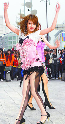 中新網3月28日電 蔡依林(Jolin)昨日(27日)在西門町封街拍新歌《花蝴蝶》舞蹈教學示范帶。Jolin身穿粉紅馬甲、黑色蕾絲邊粉紅小熱褲,腳上已舍棄美美高跟鞋,改以專業的國標舞鞋上陣,只為了避免腳踝舊疾復發。