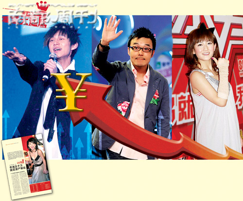 回到“2007主持人商業(yè)收入排行榜”,除了排名第六位的倪萍,前十強(qiáng)的其余九位都主持過(guò)湖南衛(wèi)視的節(jié)目,李湘、汪涵、何炅、謝娜均榜上有名。李湘近年發(fā)展重心移到北京,汪涵、何炅、謝娜成為湖南衛(wèi)視真正的臺(tái)柱子,超女、快男三戰(zhàn)下來(lái),三人的全國(guó)影響力一日千里。在這份商業(yè)榜上,即便是排名第十的謝娜,榜單公布其2007年的收入也約為830萬(wàn)元,而不久前公布的“2007湖南娛樂(lè)圈財(cái)富榜”上,何炅、汪涵分別以780萬(wàn)和620萬(wàn)年收入位居榜首和探花。2007年福布斯內(nèi)地名人榜中,三人也分別躋身前一百位,紛紛挺進(jìn)千萬(wàn)俱樂(lè)部。在接受本刊訪問(wèn)時(shí),汪涵不諱言自己是湖南臺(tái)簽約主持人中身價(jià)最高的,而何炅則坦率承認(rèn)自己是“編外”人員中最能吸金的。