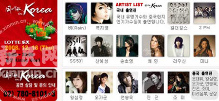 新民網(wǎng)記者從《同一首歌in korea》的官方網(wǎng)站了解到,此次參加該晚會(huì)的名單分“韓國(guó)演出者”與“中國(guó)演出者”。韓方派出申慧星、Rain、蔡妍等藝人,中方參加的包括趙薇、陳坤、言承旭、王心凌等人。