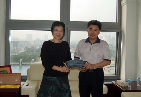 東莞市外僑局局長蔣小鶯(左)向茂名市外僑局副局長鐘勝通贈送紀念品