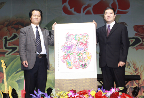 演出前,國務院僑辦與威尼斯華僑華人聯合總會互贈紀念品。圖為任啟亮副主任(右)向邱慧華會長贈送百福圖。