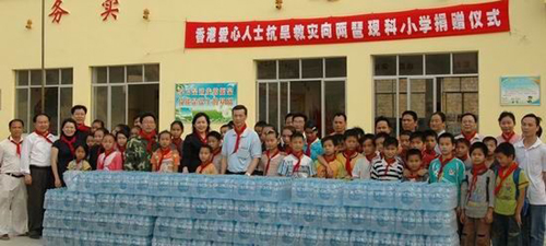 中新網(wǎng)4月14日電 據(jù)百色市右江區(qū)政協(xié)、僑辦消息,“好久沒水喝了,香港謝先生為我們送來的救命水,真香真甜!”瑤寨小學(xué)生黃莉莉同學(xué)高興地說。經(jīng)廣西壯族自治區(qū)僑辦牽線搭橋,4月9日,香港謝家忠、葉林慧儀、原秋明等25位愛心人士,帶著價(jià)值40000元的礦泉水、一套大功率抽水設(shè)備來到了旺甸瑤族鄉(xiāng)兩琶村小學(xué),捐贈給該小學(xué)的師生。