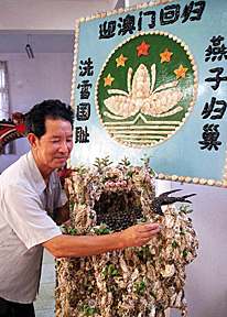 浙江省玉環(huán)縣水族工藝館原館長(zhǎng)鄭高金,最近用一千五百多只貝殼創(chuàng)作了一件迎澳門回歸的貝雕作品「燕子歸巢」。