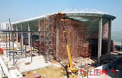 澳門政權(quán)移交大典場(chǎng)館外的腳手架開始拆除,場(chǎng)館的外部形象初步顯現(xiàn)。 中新社傳真 毛建軍 攝