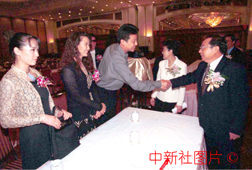 二十七集電視連續劇《澳門的故事》首映式九日在澳門舉行,這是中國中央電視臺為迎接澳門回歸而精心制作的重點劇目。新華社澳門分社社長王啟人(右)在首映式上向劇中主要演員(左起)李琳、趙越、佟凡表示祝賀。