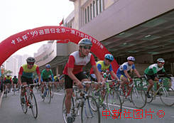 中旅杯99'迎回歸北京-澳門自行車拉力賽十五日在澳門展開決逐,騎手們奮勇爭先,志在奪標。 中新社傳真 毛建軍攝