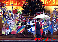 澳門十六日細雨菲菲,一位行人打傘走過一家酒店裝飾有迎回歸彩畫的玻璃門前。