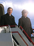 布什總統(tǒng)夫婦步出專(zhuān)機(jī)