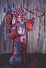 鎧甲類 古代作戰(zhàn)時,戰(zhàn)士穿的鎧甲,在京劇舞臺上叫靠,是一種美化了的舞蹈服裝。靠是用和色的素緞子制成的,上面用金、銀彩線繡滿鱗甲,看上去輝煌奪目。 靠分男靠、女靠。 男靠式樣是分前后兩扇披在肩上,還有護(hù)領(lǐng)、護(hù)肩、下甲、吊魚、靠肚子以及收緊的瘦袖。 女靠上身與男靠形式差不多,下身綴著五色繡花的飄帶,并在靠里襯著裙子,但在開打時,里面也不裙子。 靠一般分硬靠、軟靠和改良靠三種, 穿用人物有《霸王別姬》中的項羽(穿平金黑靠)、《古城會》中的關(guān)羽(穿平金綠靠)、《挑滑車》中的岳飛(穿白靠)、高寵(穿藍(lán)靠)、《連環(huán)計》中的呂布(穿粉靠)、《破洪州》中的楊宗保(穿淡湖靠)等。 戲曲舞臺上扮演女將、女統(tǒng)帥的戰(zhàn)服多采用女大靠。戲劇中使用的大靠與古代生活中的甲胄并不一樣。隨著戲曲藝術(shù)的發(fā)展,大靠的式樣和色彩逐漸增多,但距生活服裝也越來越遠(yuǎn)。它純屬為了適應(yīng)舞臺表演的需要而設(shè)計。 建國前女大靠種類較少,只有梅蘭芳演出《穆柯寨》"花廳招親"一場戲穿用"玻璃肚子"(用玻璃棍裝飾的改良靠)。建國后女靠樣式逐漸增多,色彩不斷豐富。戲曲服裝中,女靠比男靠樣式多,而男靠比女靠色彩豐富,女靠只有粉紅、大紅、淡湖等色。新編歷史劇《楊門女將》出臺之后,出現(xiàn)了女白靠、黑靠、雪青靠、米黃靠等。 穿用人物有新編歷史劇《三請樊梨花》中的樊梨花、 軟靠:背后不插靠旗。一般是老年體弱的老將穿用。 改良靠:樣式與軟靠近似,只要腰身既緊又瘦,幾乎就象用腰帶系在身上。有的繡鱗甲,有的繡些花紋或鑲上一些鍍鎳的金屬凸片或看著晶光閃亮象圓釘子形的裝飾。 戲曲舞臺上扮演番將、武將群眾或新編歷史劇中常用改良靠。穿用人物有《雛鳳排空》中的番將韓昌、《三打陶三春》的鄭子明、《鬧龍宮》中的龍子等。 鎧是戲曲舞臺上扮演皇家殿前御林軍、隨駕儀仗隊或軍中統(tǒng)帥的服裝,又稱大鎧。色彩以紅為主,多繡平金幾何圖形紋樣。它的造型與生活中的甲胄相似。可見它是以古代生活服裝為依據(jù)的,只是做法不一。生活服裝有銅釘(有的鍍金)固定在衣服上,而舞臺上的大鎧以平金繡為主。這種穿大鎧的武士在舞臺上只是擺排場,壯聲勢,沒有武打動作。